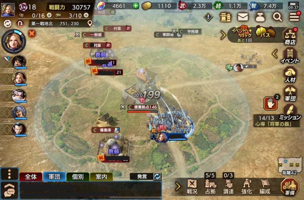 ゲームシステムは「戦国覇王戦記」と同じで、作業ゲーの要素が多い。武将を集め、育て、施設のレベルを上げていくというもの。軍団に加入し、陣取り合戦を繰り広げ、都を目指すのが目標だ。「戦国覇王戦記」とひとつ異なるのが、シーズンによって武将や施設のレベルがリセットされる点だ。入手した武将や武将ランク(同じ武将を消費して上げる)は引き継げるものの、ほとんどがリセットされるのでマンネリ化しにくいという利点がある。