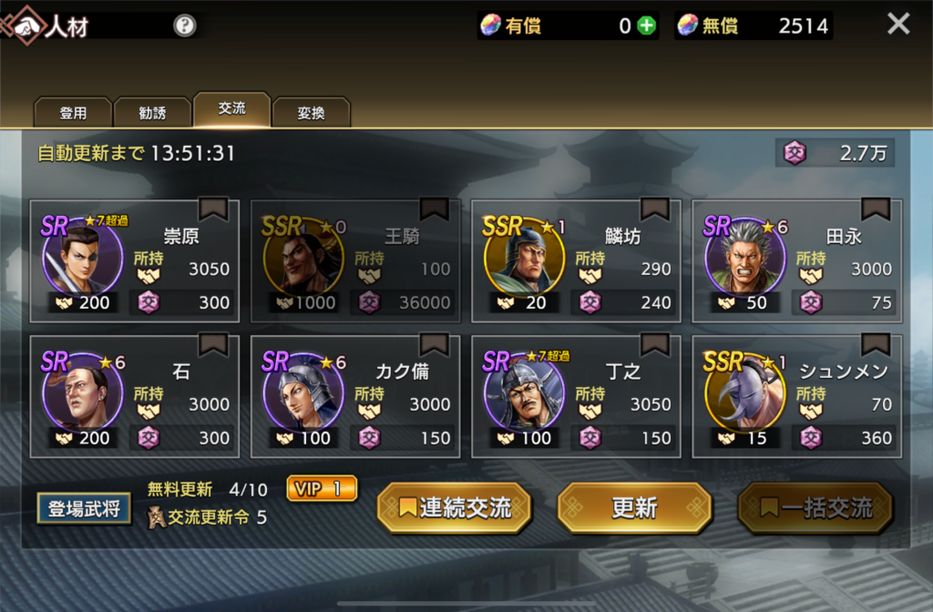 交流で友好度を上げよう!狙うはSSR武将の入手