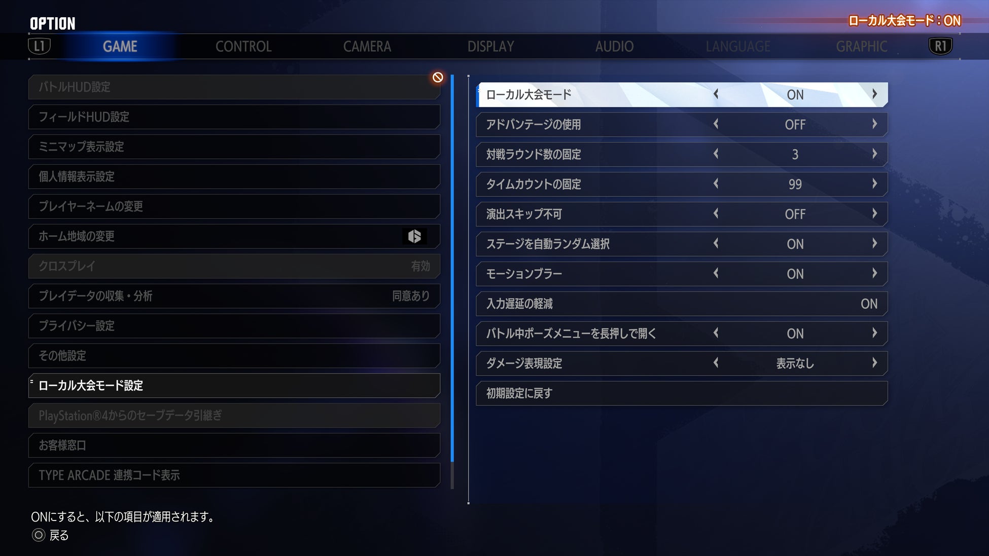 新たに「ローカル大会モード」が導入された。このモードをONにすると、演出のスキップを無効にしたり、ステージの自動ランダム選択を有効にしたりできる。大会運営者にとって便利な機能が追加され、よりスムーズな試合進行が可能となる。