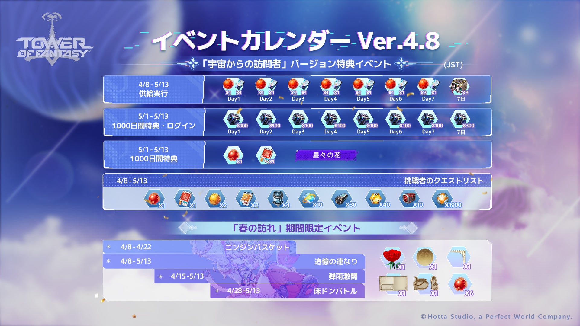 Ver.4.8のアップデートに合わせて、スペシャルイベント「春の訪れ」がゲーム内で開始された。イベントに参加することで、最大112回分のガチャ相当アイテムや、煙水晶×1000個など豪華報酬が無料で手に入るチャンスとなっている。