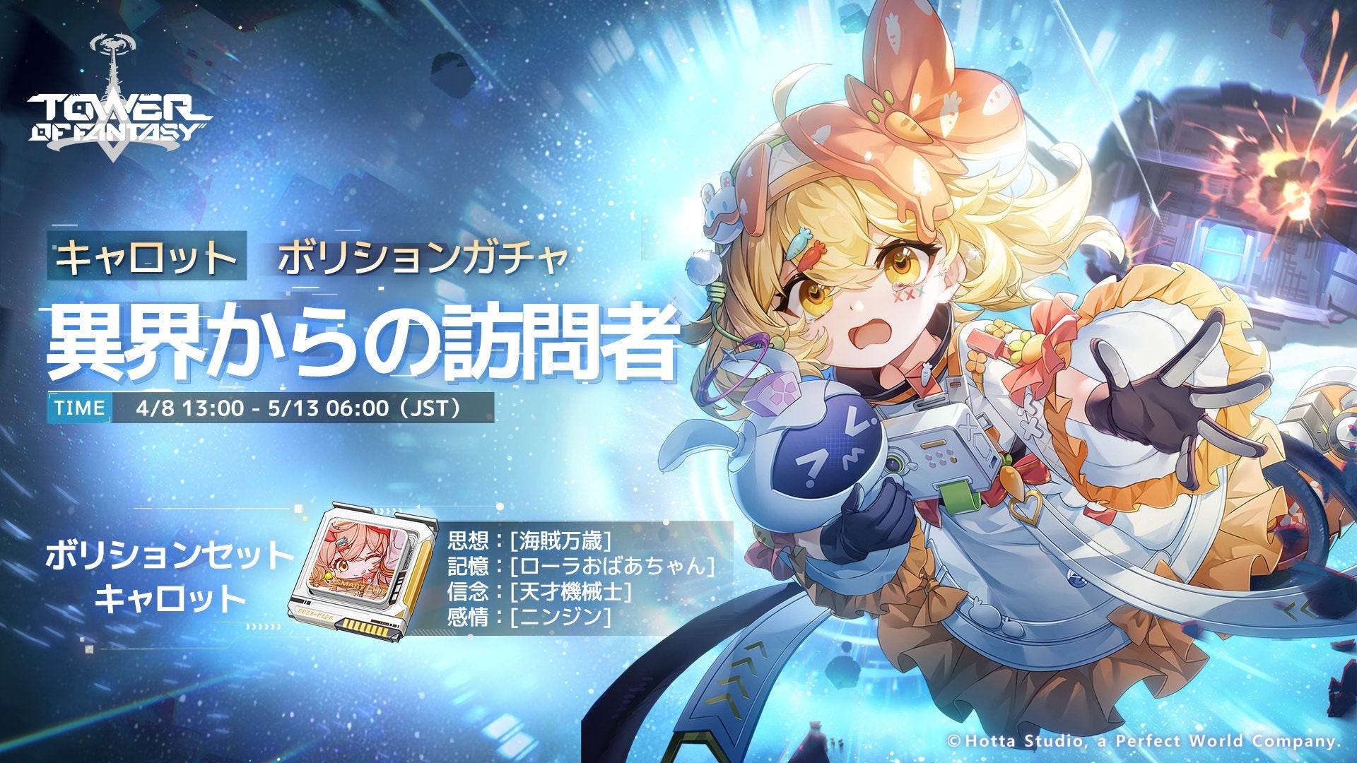 Perfect World Gamesは、モバイルおよびPC、さらにPlayStation 5/PlayStation 4向けに展開中のオープンワールドRPG『Tower of Fantasy(幻塔)』にて、最新アップデートVer.4.8「宇宙からの訪問者」の配信を開始した。本アップデートでは、プレイヤー注目の新アバター「キャロット」が実装されており、期間限定イベントも同時にスタートしている。