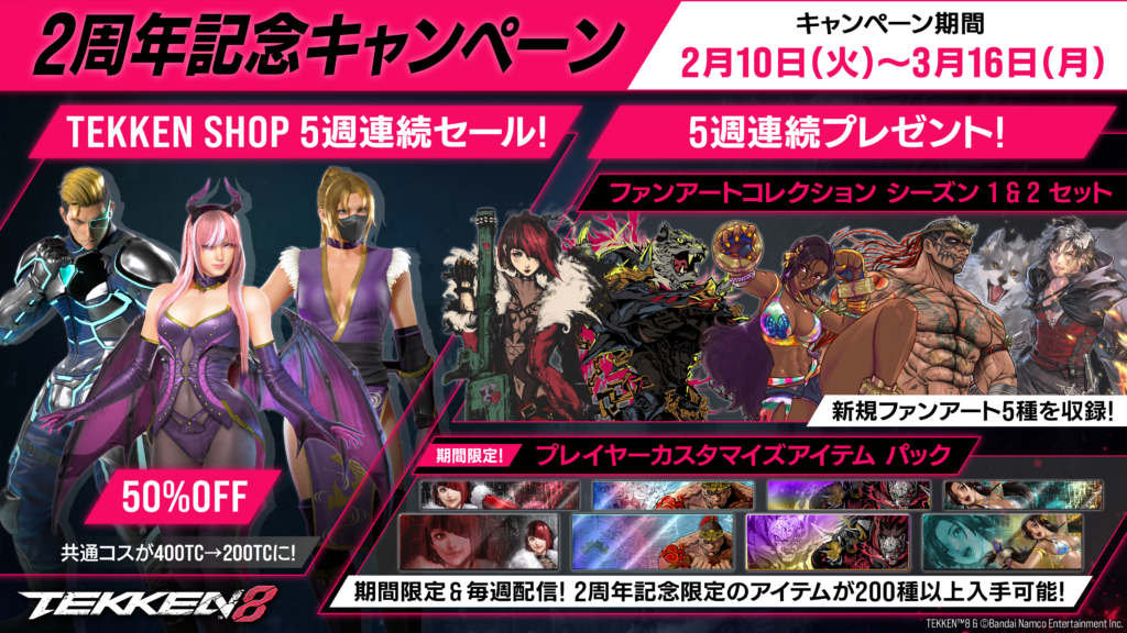 ゲーム内「TEKKEN SHOP」では、販売中のコスチュームが5週連続で半額となる割引セールを実施する。期間は2026年2月10日から3月16日までで、週替わりで対象商品が切り替わる形式である。