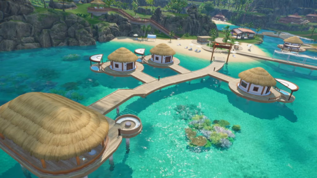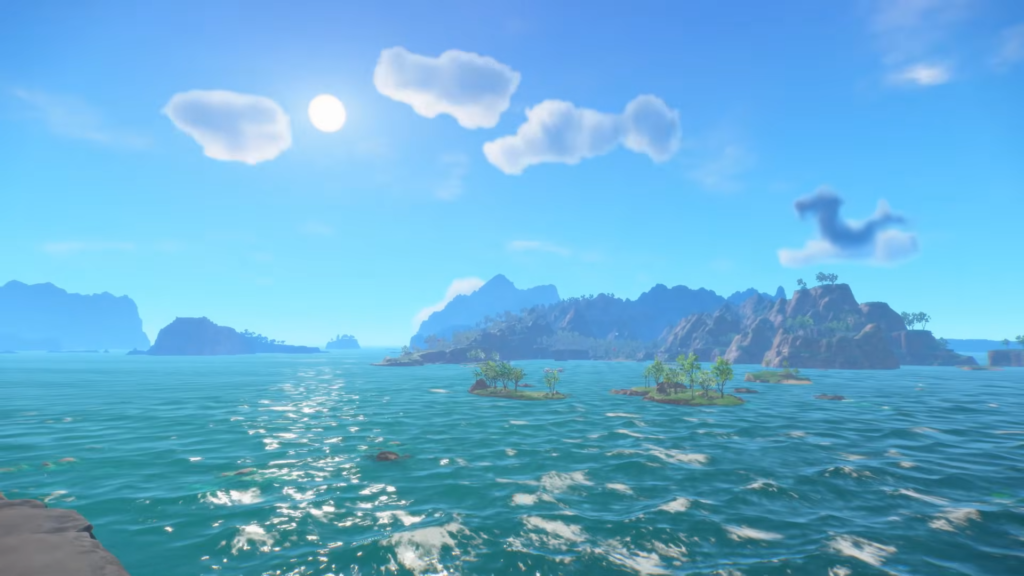 本作の舞台は、風が吹き抜ける美しい島々と、きらめく波が寄せ返す広大な海が広がる新地方である。オープンワールドで表現されたフィールドには、自然と調和して生きるポケモンたちの独自の生態系が息づいている。トレーラーでは、雄大な海岸線、透き通る水面、点在する島々、水上コテージ、そして風車のある風景などが確認できる。